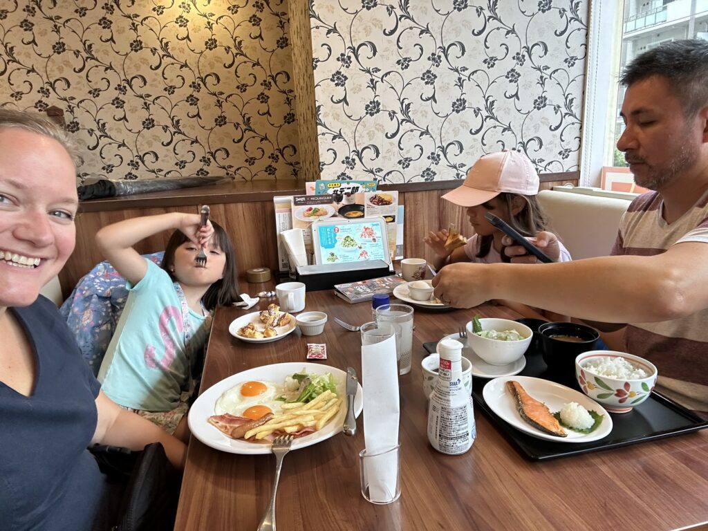 Jetlag is fun! Brain fully awake from 4am. In Japan thou doest not make noise when others may be sleeping! Trying to tell an over-excited Maylin to be quiet at 5am, trying to pack up the pull out bed so we had space to move, trying to open the biggest suitcase to get clothes out… Yes it was a noisy morning, and I apologize to the people who may or may not be occupying the apartment below us, I really hope there was nobody there. We had set our sights on Denny’s (yes, THAT Denny’s) for our first Japanese breakfast, as it promised both Western and Japanese options. They didn’t open until 7am, so the rest of our 7Eleven snacks were devoured before we could get on our way.
