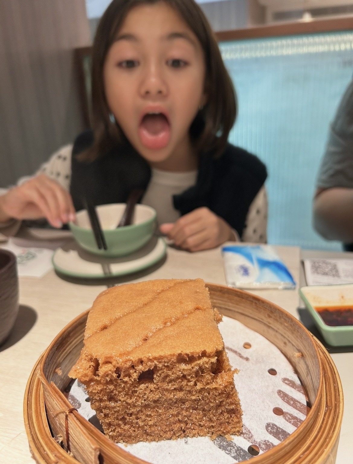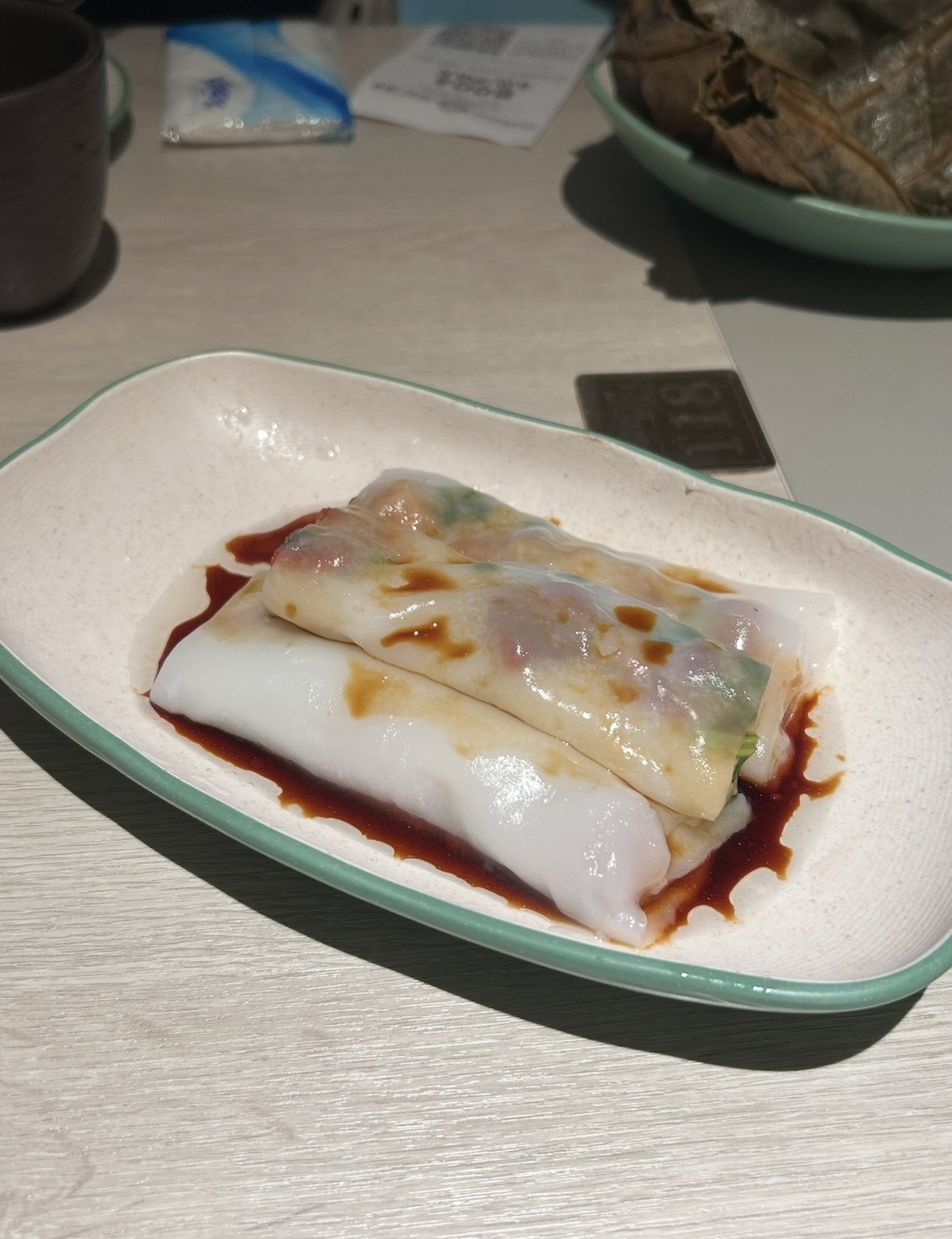Then, at the end, when both girls said they were full, and Joe and I were probably good, but wanted something new and creative, we ordered just one more dish. Remembering the shrimp stuffed Chinese donut wrapped in rice roll that we had with Joe’s aunt on the day that Maylin got sick and I had to take her home, we order a similar sounding dish here.