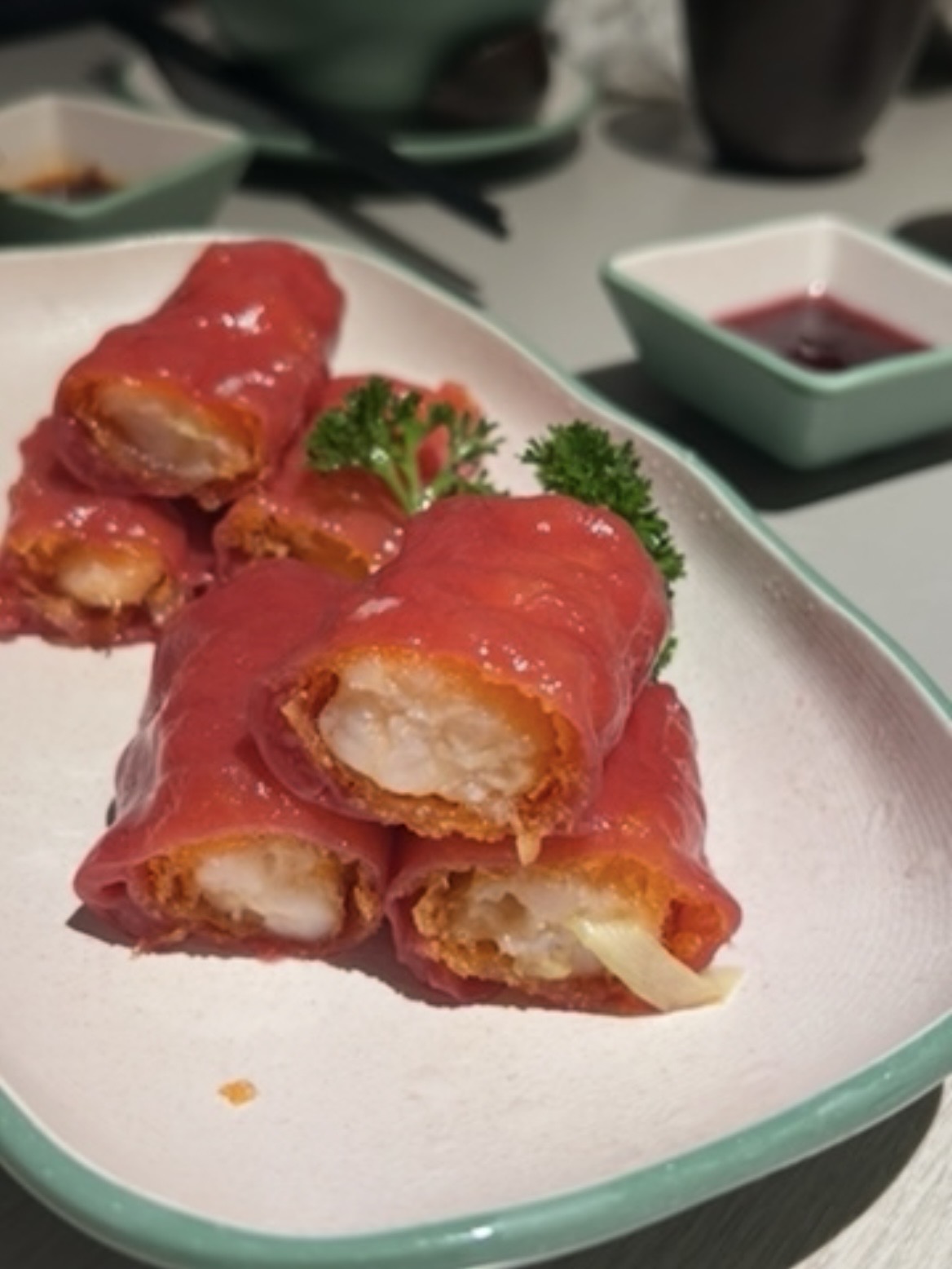 The shrimp was still stuffed inside a donut, the donut was still wrapped in rice roll, but the rice roll was flavoured with rosella (the hibiscus, not the parrot)! Alongside it came a small dish of rosella jam. Joe and I preferred the rice roll with a drop of chili oil, but what an experience! Very different, very creative, our curious palates satisfied.