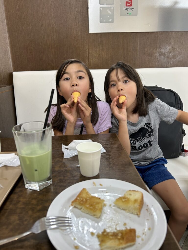 It stopped raining, so after school and a quick lunch at home, we set out to hunt for new streets and groceries. Today, Maylin and I decided to guide the others back to where we found a department store, a Daiso, a grocery store and – Holly’s Café. There’s actually quite a few of them, and now that we know what they are, we see them everywhere!