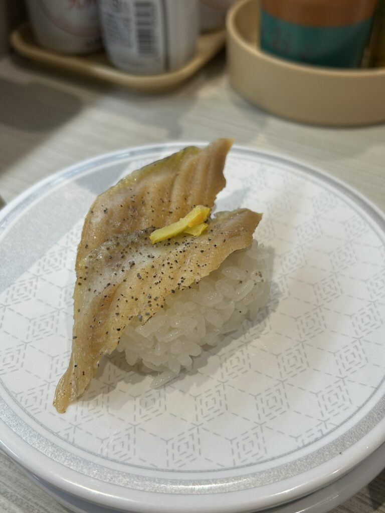 We had so much good food tonight! There was smoked duck sushi, pork rib sushi, scallops and tuna and salmon! Unfortunately, we devour it all as it comes off the belt, there simply is no time for photos! Except for this piece of eel!