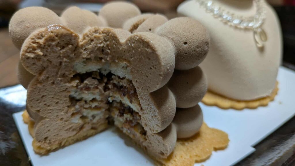 It reminds me of the Cedric Grolet creations I tried in Paris last year, however these are their own pieces of art, not made to look like what they are made from. Just look at that diamond necklace display! The patisserie employee who boxed these up for me asked me how long it would take me to get home with the desserts, because once carefully placed and taped into a box, they then get a tiny little ice pack! I’m guessing they increase the number of ice packs depending on timing.
