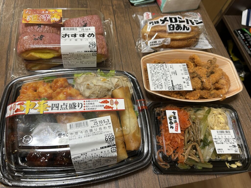 We ended up picking some dinner items and a few snack items (this is why the girls always come with when I go to the store). In the below picture we have (clockwise from top left): purple sweet potato pastries, “melon pan” (a sweet bun, this one with a mystery filling), fried octopus, pickled assorted veggies, and a tray of meatballs, siu mai (Chinese pork and shrimp dumplings), fried sweet and sour shrimp and spring rolls.