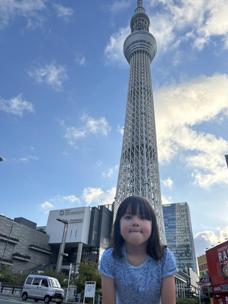 The day started early. So much for being over jet lag. It seems like Joe and the girls are doing better, but I’m a mess. The good thing is, this allowed me to connect with my long time friend Kaoru, who lives on Vancouver Island, and just happens to be visiting her brother in Tokyo this week. We agreed to meet for breakfast at 7.30am, which allowed Maylin and I to go for an early morning walk while Joe and Téa stayed asleep. Maylin and I walked all the way to the base of the Tokyo SkyTree, enjoying a 7Eleven snack and a vending machine drink along the way.