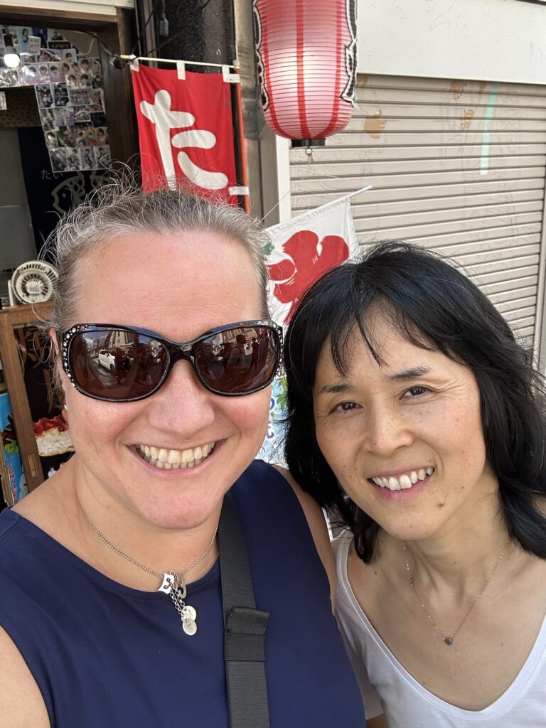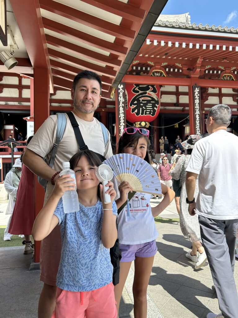 We got back to the apartment just in time to pick Joe and Téa up, before setting out to meet Kaoru for breakfast. Kaoru and her parents met us by the entrance to the Asakusa Shrine, where they would go off to do their thing, and Kaoru would hang out with us. We lined up at an Asakusa traditional Japanese/Western cafe, waited about 30 minutes in the high heat (yes, even before 8am!). We all ordered our own breakfast dishes this time, so for once I had a full breakfast! Kaoru was able to translate and explain all the things during our visit, and we got talking to the guests at the next table. The two young girls had to speak English with a stranger as part of their homework, so they stuttered some polite phrases, including “what is your favourite colour”, and we took a picture to prove they had spoken with us.