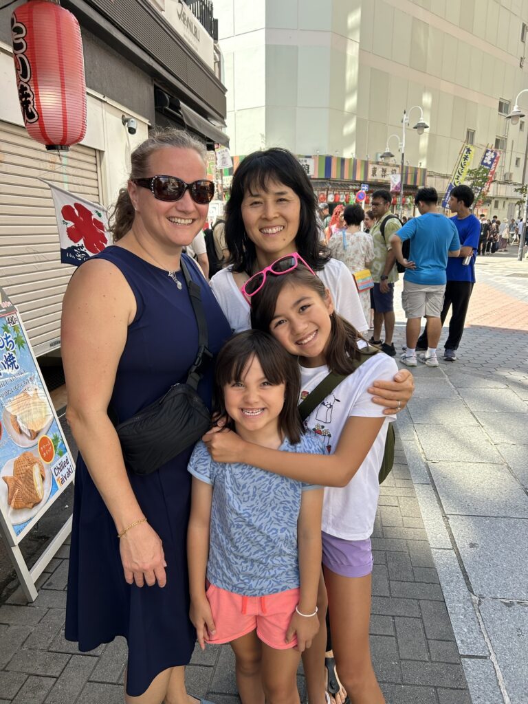 After breakfast, we walked through the streets surrounding the shrine, with Kaoru pointing out and explaining dishes and favourite toys along the way. The Gacha Store would open later, and we planned to return. Then we rounded a corner, and THERE was the Don Quijote on steroids! Four crammed but large floors of things, things, medicine, skincare, treats, souvenirs, luggage, clothing, electronic doodads, and some more things. Kaoru had never spent more than the absolutely necessary time inside a Donki store, but our girls went gaga over the THINGS they saw. Joe picked up some necessities (hello personal fans for Disney coming up) and a couple of trinkets for the girls, and after about an hour or so we said goodbye for now to this overwhelming store. It’s open 24 hours though, so who knows if Maylin and I will make it our destination one of these mornings?