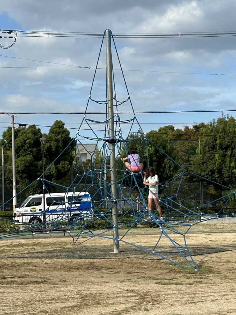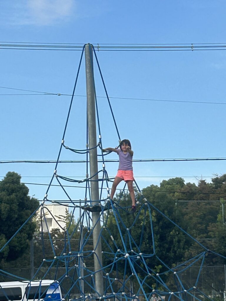 With smoothies in hand, we set off again. It was still unbearably hot, but this time we got all the way down to the far playground, the one with the interesting looking climbing structures that we spotted on our walk on day 1 in Osaka. And they were just as fun as they looked! Both girls were off running as soon as they dumped their stuff on my bench.