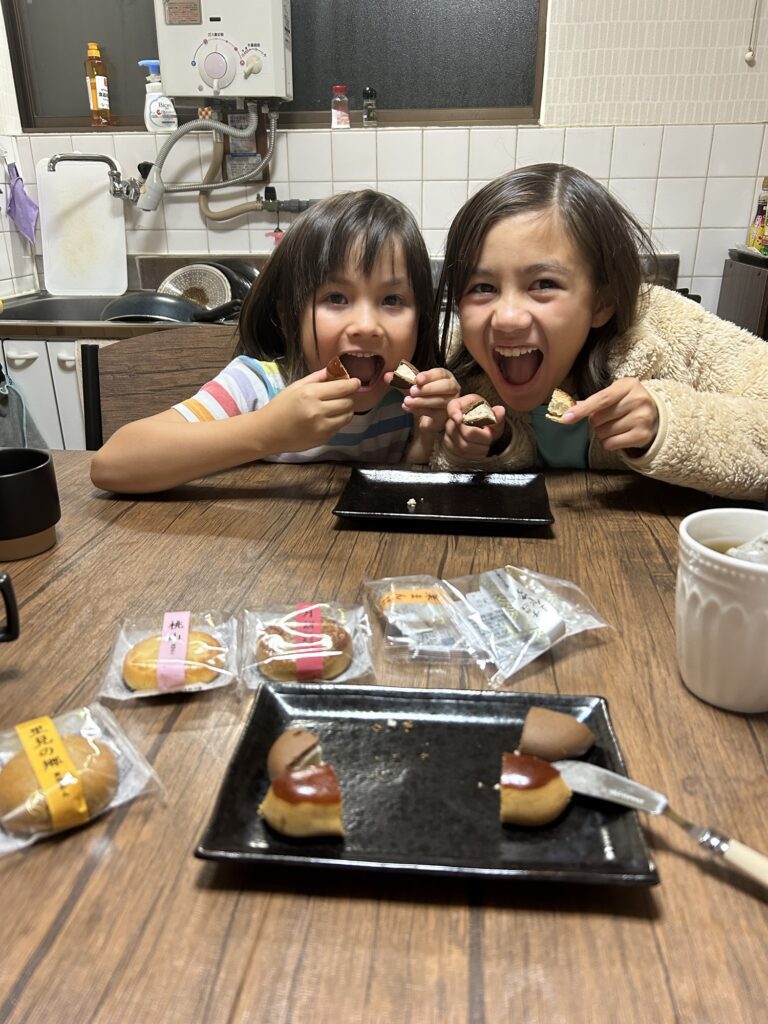After a yummy pasta dinner with meat sauce, the girls played for a bit before it was finally time to cut into and sample some of these new flavours! We decided the chestnut and white bean paste cakes were first up, and of course we all have an equal share.