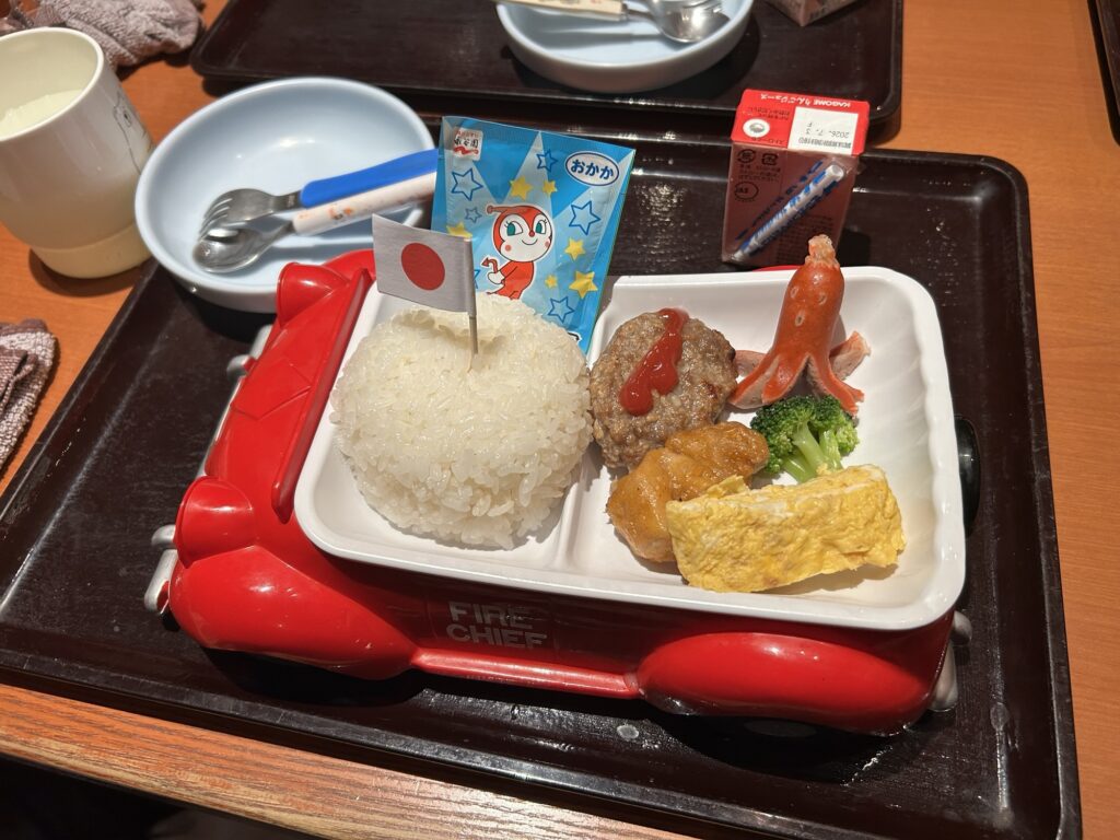The girls picked the kids set, which is always a safe choice. This time it had a meat patty, a hot dog, a chicken nugget, a slice of omelette, some rice, a juice box and a couple of jello “shots” (non alcoholic, just teeny tiny and you’re supposed to gulp them down in one shot). The server also came over with a giant plastic basket with toys to choose from, so both girls got a new toy with their meals. And getting to eat their meal out of a fire truck? SO COOL!