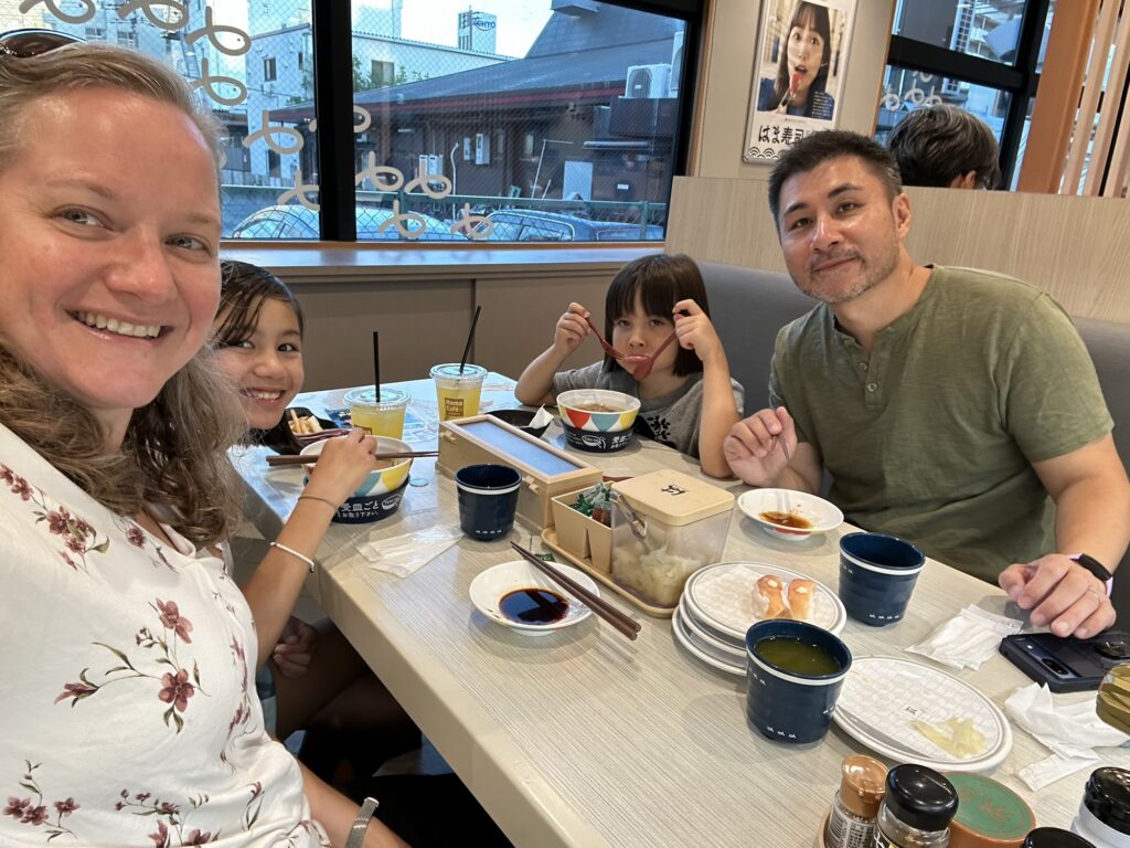 It’s just so easy to have a delicious time at this restaurant. It is not a Michelin starred place, there is near zero service here (machine to tell you which table to go to, you order through a tablet, a conveyor belt brings you your food, a machine to pay through), but it is fresh, it’s fast, the girls love the $4.50 kids sets, they get a gacha toy with each meal, and Joe and I get to stuff our faces with raw fish at less than $1 per plate. It’s win win win win in all the areas!