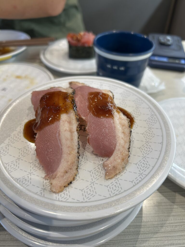 After a hot, busy and stressful 24 hours, we were in no mood to cook, but we are always in the mood for some conveyor belt sushi! We got one of the very last tables, the place was just as packed when we left today as it was last night when we couldn’t get in. Considering we came here on our very first day in Osaka and were one of only a handful of tables in the place, today was PACKED! There’s a little jingle when a dish comes for your table, you just have to listen carefully if it’s your bell going off, or the one in front, behind, or on the other side of the glass.