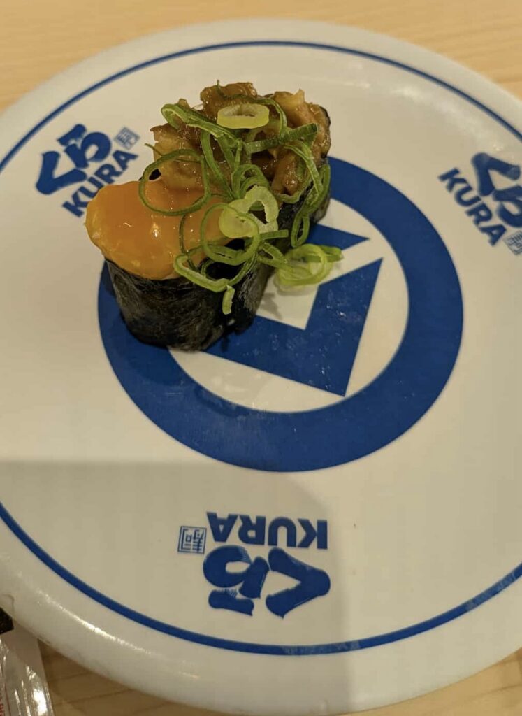 Because of the heat, we are exhausted and aim for the bus home. There are very few people on the bus, so it’s a cool and relaxing hour before we’re back at the SkyTree station. I’ve decided for my birthday dinner we should try a conveyor belt sushi restaurant, and there’s one right next to the station! Kura sushi seats us, serves us and bills us, all without having to actually talk to a single person. There is staff available to help out, clean up and of course in the kitchen preparing the dishes, but the conveyor belt serves us, the table provides bottomless green tea, chopsticks, cutlery, napkins, toothpicks and a tablet to order from. There are two levels of conveyor belts in what would have been the inside wall of a traditional North American restaurant booth, the bottom belt has whatever sushi they have made and send around for you to pick up if you are hungry and just need food NOW. All the lower belt sushi is ¥150 (approx $1.50) per plate, and at the end you feed your plates into a slot on the table to tally up your bill. The top belt is where they prepare your special order sushi, the more expensive items, and any non sushi items. When your order is arriving, your tablet goes DING, and when you look up, the conveyor belt draws to a halt and you pick up your order.