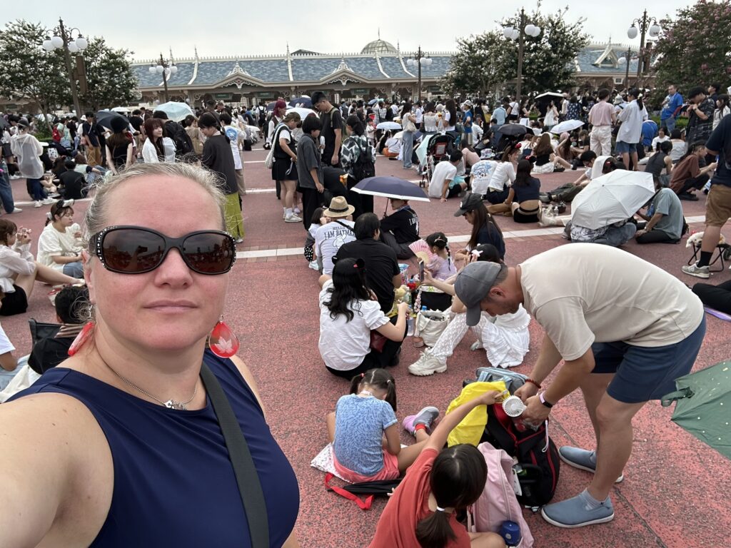 We arrive at Tokyo Disney just after 8am, and the lineups are impressive. In Japan, where people are generally ultra polite and disciplined, neat lines are formed and the waiting visitors sit on down on special mats they buy for these purposes. This is the only country where I have seen Disney (or any other park) entry lines this well behaved. It is however about a million degrees, whether you speak Farenheit or Celcius, and umbrellas are up and fans are draining battery as the seconds tick by.