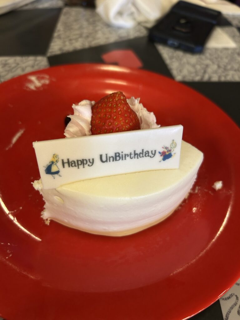 Next, we head for whatever has the shortest line, with the park app keeping us on track. Our first ride is It’s a Small World, and it’s the perfect intro to what Disney magic is. We marvel at all the characters we recognize, and sing along to the music. Coming back outside it is WAY too hot, so we decide it’s time for lunch. I have decided to test the rumour that the Queen of Hearts Banquet Hall will switch out the decoration on their Unbirthday Cake with an actual Happy Birthday sign. Unfortunately, this proved NOT to be true in Tokyo Disney, but I still ended up loving my Unbirthday cake just as much nonetheless. And just because I was kind of impressed, their flank steak meal was really good as well!