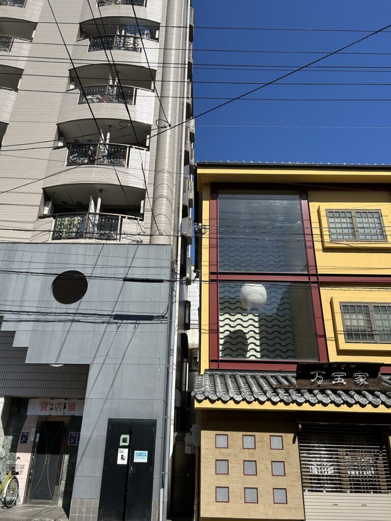 On our walk this morning, Maylin points up to the building on the left and says “That’s a cool building, mom, you should take a picture of it”, not even noticing that the building right next door has practically 25% of the usable area dedicated to a two storey paper lantern and a funky black and white wall paper!
