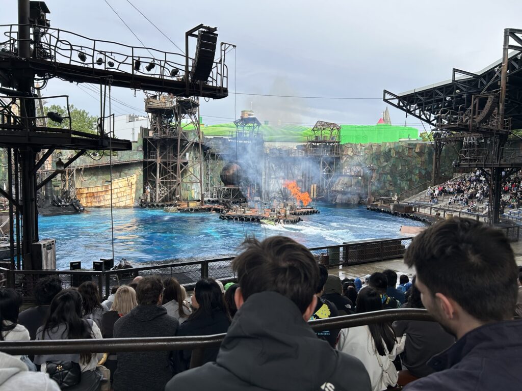 From SNW we were planning on going to the Minion area, but saw that WaterWorld was opening up for the first live show of the day, so of course we lined up for that instead. We are so glad we did! The show was scheduled to start at 11am, but ten minutes before then, three of the actors started entertaining the crowds. Anyone sitting on the blue rows at the front of the audience was warned they may get wet, and boy did they get WET! The actors would take enormous water cannons and spray towards the audience, with some especially lucky audience members getting an entire bucket of water over their heads, all in the name of entertaining the rest of the audience.