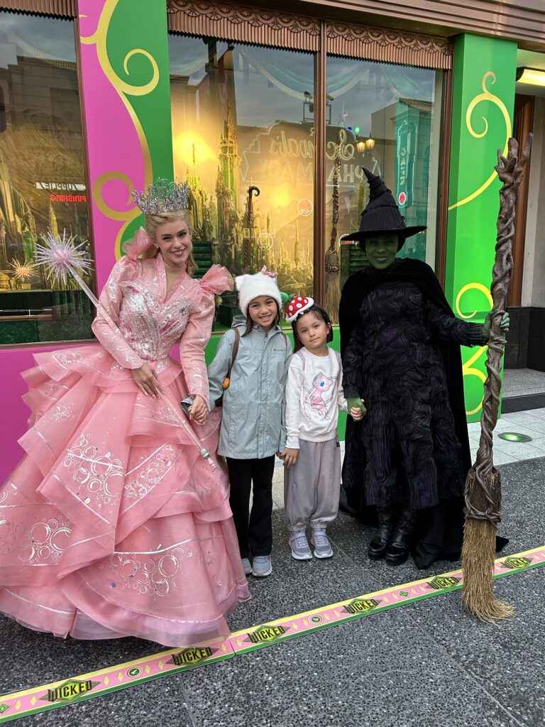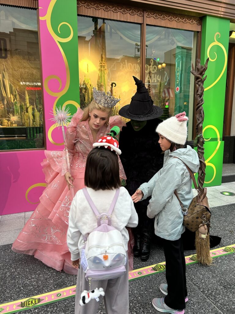 By this time, it was after 4pm, and while not yet sunset, it was getting darker, cloudier and colder. We decided we had done enough and had very little energy left, so headed for the exit. On our way there, we saw some familiar colours, and a taped off portion of the sidewalk. We were among the first to line up, and Joe got us front and centre spots. After about 15 minutes, when Glinda and Elphaba finally appeared, they spoke to the audience, and then selected Téa and Maylin for this afternoon’s first meet and greet. They were such good actresses, a polite and engaging little conversation, and then pictures to end.