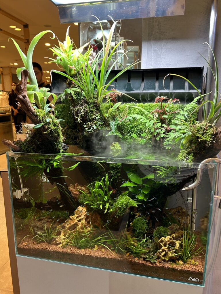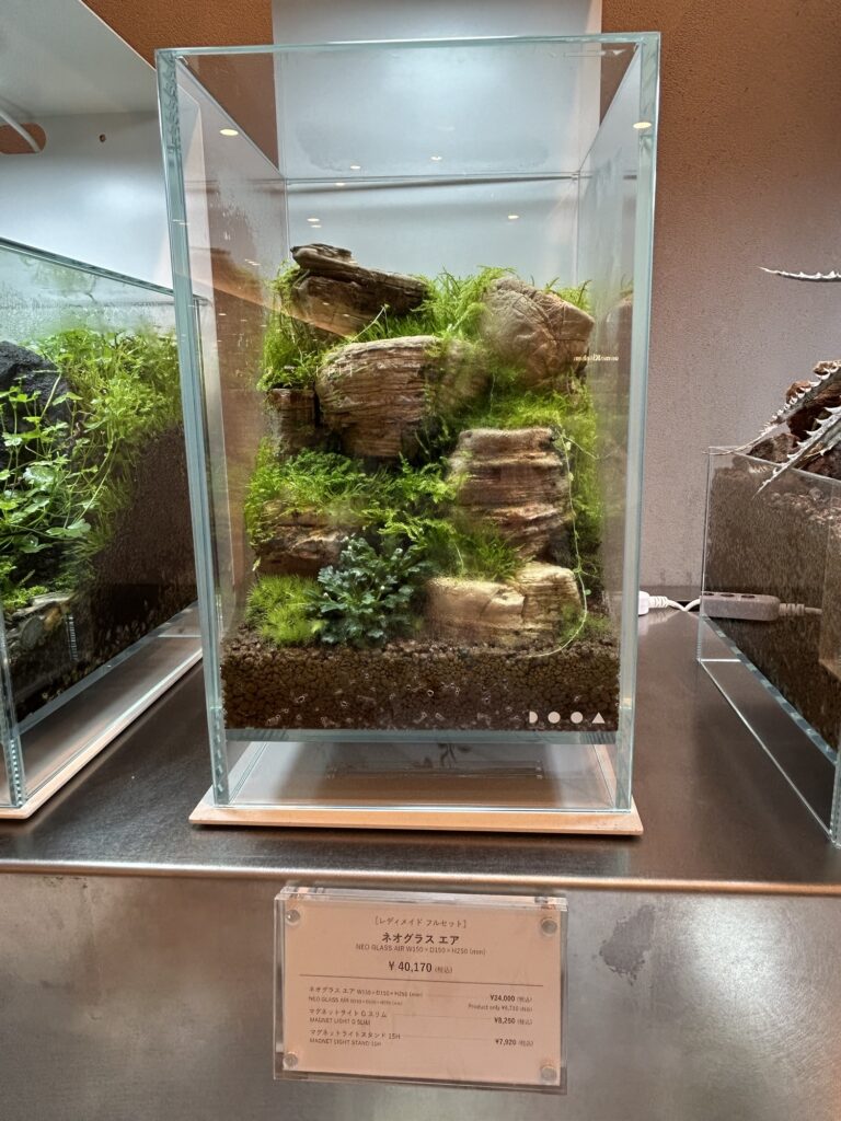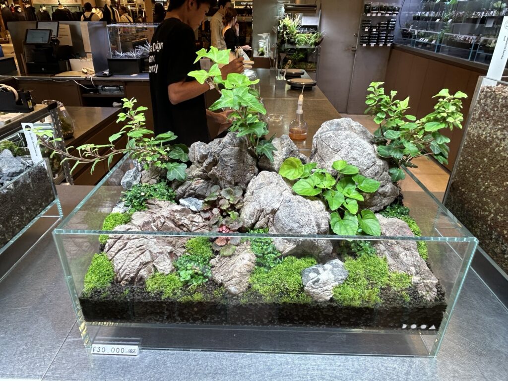 We continued down the escalators and suddenly saw an aquarium we needed to take a closer look at. This lead us to an amazing store focusing on indoor wet gardens, where Japanese hobby gardeners don’t need any outdoor space or big trees in small pots to create landscaping art. The below creation had cold fog seeping out from above and creating quite the magical and serene environment to look at. I could totally see myself having one of these things – if I can get Joe to care for it. I have zero green thumbs, and it would quickly die in my care.